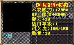 真玲瓏蘊光:術攻威力+200,法術命中+90,智力+10,HP+5000(根據職業選擇武器種類)