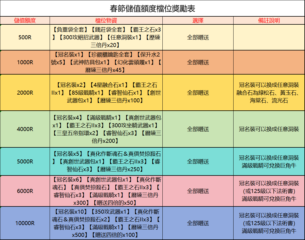 充值額度檔位獎勵如圖。