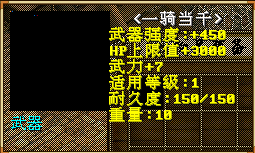 一騎當千:武器強度+450,武器命中+90,武力+7,HP+3000(根據職業選擇武器種類)